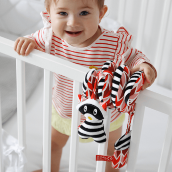 Levar o brinquedo favorito da criança consigo deixou de ser uma preocupação. Os brinquedos com argolas permitem prender a uma cadeirinha de carro, um berço ou um carrinho de bebé. Com a ajuda da mola, você também pode prendê-los na roupa da criança, para que o brinquedo favorito esteja sempre por perto. As argolas são leves e não representam qualquer ameaça para os bebés.