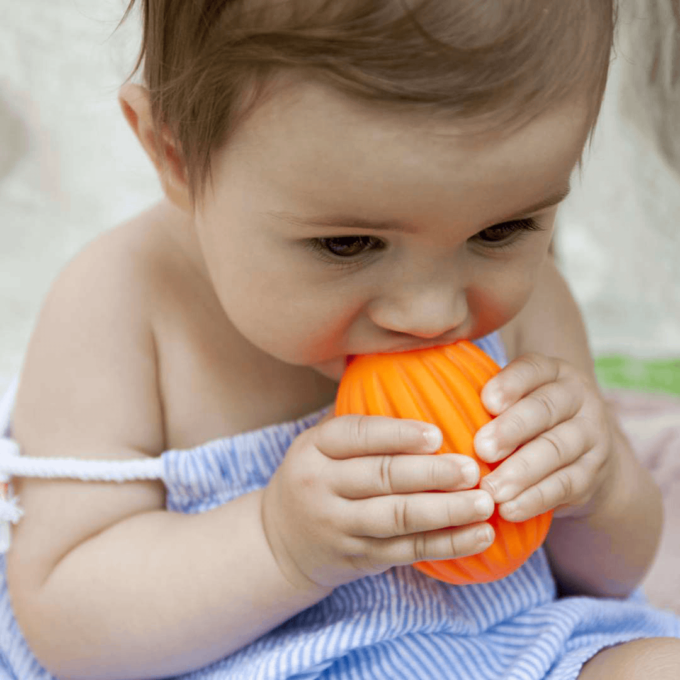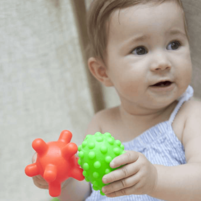 Cores vibrantes e uma textura diversa são elementos característicos das Bolas Sensoriais- Sensorky. Estas bolas sensoriais são projetadas para estimular os receptores sensoriais de uma criança. Bebés até aos 3 meses de idade estão em fase de perfeita adaptação à vida fora da barriga da mãe, fletindo os músculos, que podem ser relaxados com uma massagem suave com uma bola nas costas e pernas do bebé, ou mesmo em todo o corpo. Um bebé relaxado sente mais conforto, o que torna o momento de adormecer mais rápido. Entregar a bola diretamente ao bebé desenvolve os músculos das mãos. Além disso, agarrar, rolar e lançar a bola melhora as habilidades manuais do bebé e a sua coordenação entre agarrar e ver conscientemente. As bolas sensoriais são perfeitas para brincar na banheira. A hora do banho é então associada ao prazer. Além disso, as ranhuras e restantes morfologias são elementos interessantes para as crianças quando precisam apreender o mundo que os rodeia.