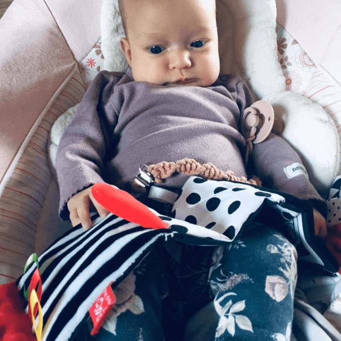 Um livro sensorial macio, feito em tecido, com todo o cuidado e atenção  da Mom’s Care. Foi desenvolvido para os mais novos por forma a estimular os sentidos, aspeto fundamental nos primeiros meses de vida. A visão e a percepção são desenvolvidas quando os bebés seguem os brinquedos com os olhos e se fixam neles. Desta interação os bebés apreendem o mundo e estimulam o tato. Um recém-nascido ainda não tem a visão desenvolvida, então um livro sensorial a preto e branco com um toque de azul será perfeito. A maioria dos elementos em preto e branco ajudam a desenvolver a habilidade de distinguir cores.